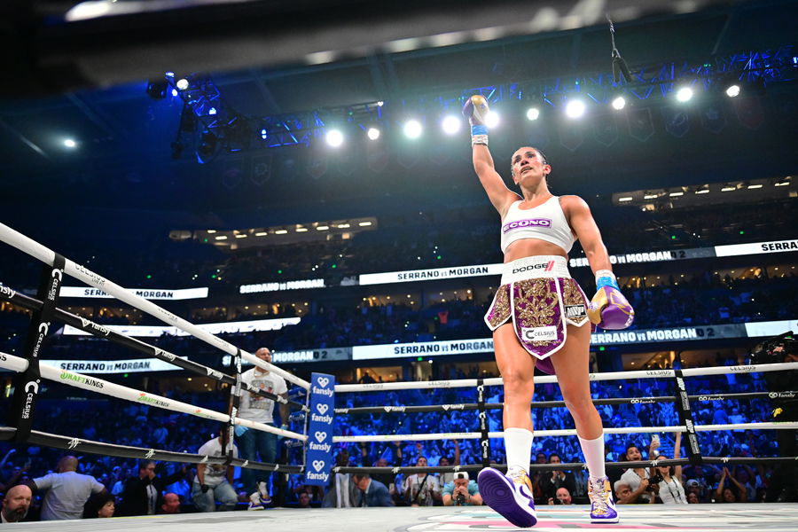 TAMPA, FLORIDA – JULY 20: Amanda Serrano walks across the ring after defeating Stevie Morgan by technical knockout in their super lightweight fight at Amalie Arena on July 20, 2024 in Tampa, Florida. (Photo by Julio Aguilar/Getty Images)