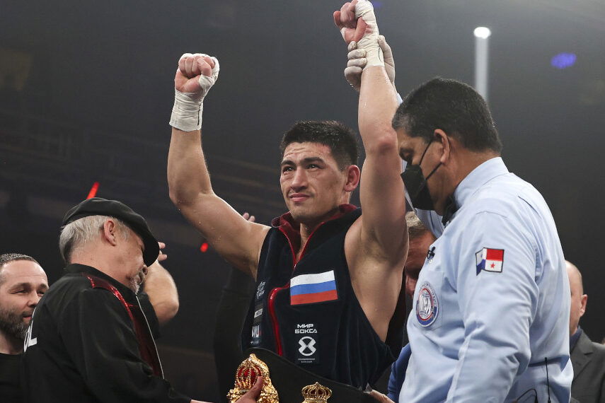 YEKATERINBURG, RUSSIA DECEMBER 12, 2021: Boxer Dmitry Bivol (C) wins a bout against boxer Umar Salamov for the WBA Super light heavyweight title as part of the RCC Boxing Promotions event at the Uralets cultural and entertainment centre. Donat Sorokin/TASS (Photo by Donat SorokinTASS via Getty Images)