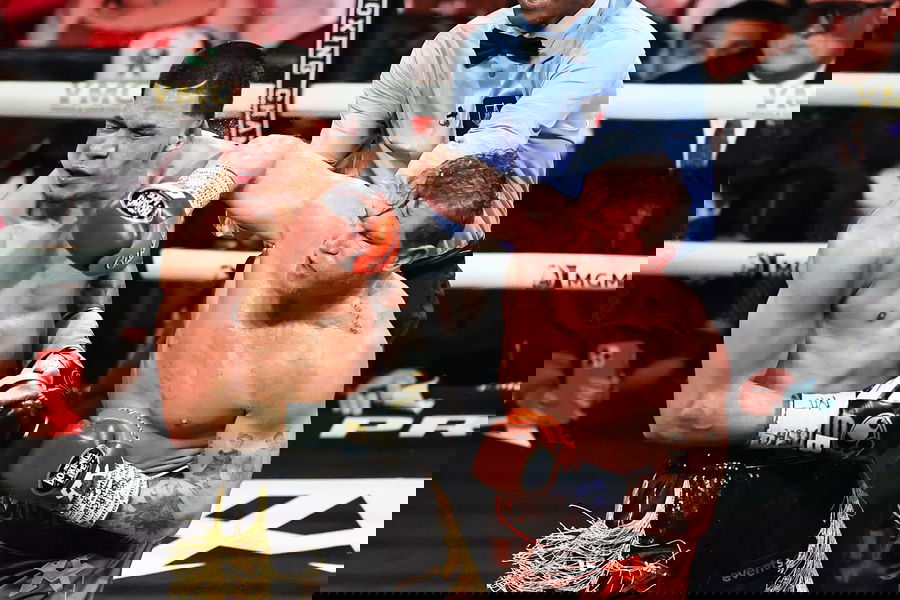 LAS VEGAS, NEVADA – SEPTEMBER 14: Saul Canelo Alvarez (R) punches Edgar Berlanga (L) during the WBC, WBA, WBO World Super Middleweight Championship fight at T-Mobile Arena on September 14, 2024 in Las Vegas, Nevada. (Photo by Omar Vega/Getty Images)