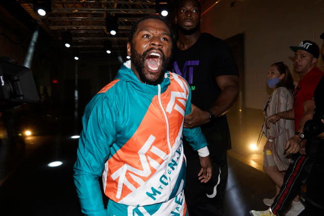 MIAMI, FL – JUNE 6: Floyd Mayweather meets with the press following the Mayweather vs Paul: Bragging Rights boxing event on June 06, 2021, at Hard Rock Stadium in Miami, Florida. (Photo by Louis Grasse/PxImages/Icon Sportswire via Getty Images)