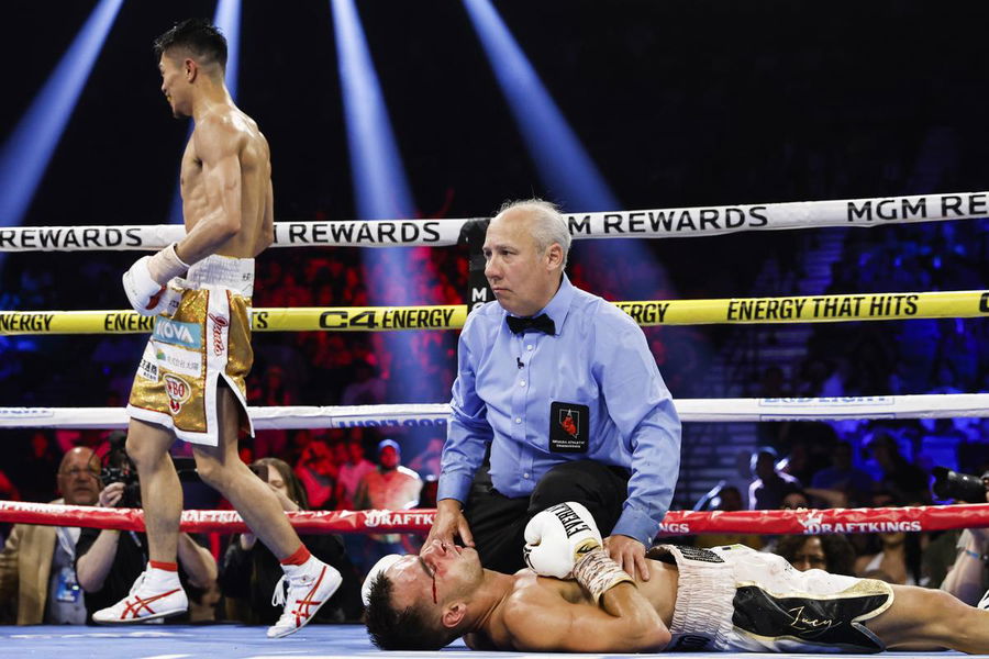 LAS VEGAS, NEVADA – MAY 20: Andrew Moloney of Australia is TKO’d by Junto Nakatani of Japan during their junior bantamweight bout at MGM Grand Garden Arena on May 20, 2023 in Las Vegas, Nevada. (Photo by Sarah Stier/Getty Images)