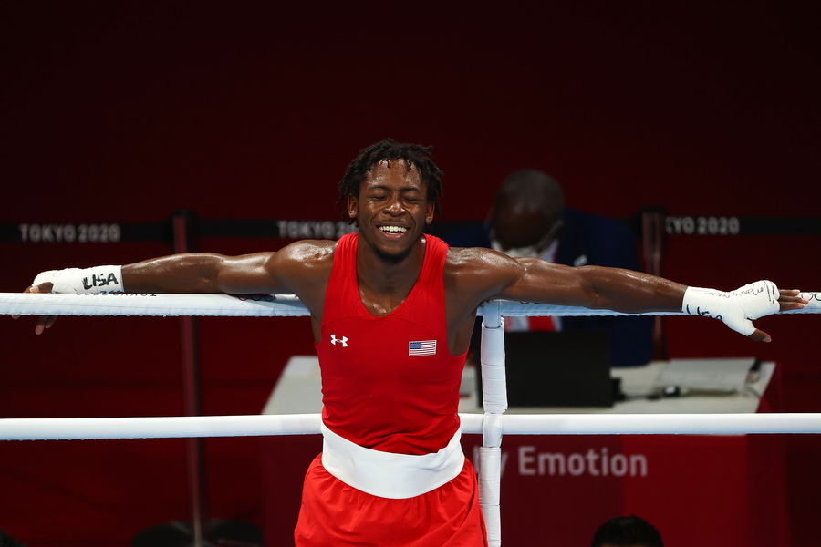 TOKYO, JAPAN – AUGUST 06: Keyshawn Davis of Team United States (red) celebrates defeating Hovhannes Bachkov of Team Armenia during the Men’s Light (57-63kg) Semifinal 1 on day fourteen of the Tokyo 2020 Olympic Games at Kokugikan Arena on August 06, 2021 in Tokyo, Japan. (Photo by Buda Mendes/Getty Images)