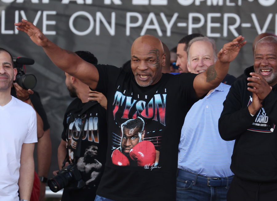 LAS VEGAS, NEVADA – APRIL 21: Former undisputed heavyweight champion Mike Tyson acknowledges the crowd before the Gervonta Davis vs Ryan Garcia fight at Toshiba Plaza on April 21, 2023 in Las Vegas, Nevada. Davis and Garcia will fight at a 136-pound catchweight at T-Mobile Arena in Las Vegas on April 22. (Photo by Al Bello/Getty Images)
