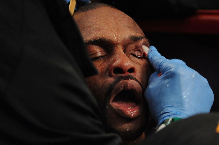 NEW YORK – NOVEMBER 08: Roy Jones Jr’s cut is tended to during the Ring Magazine Light Heavyweight Championship bout against Joe Calzaghe of Wales at Madison Square Garden November 8, 2008 in New York City. (Photo by Al Bello/Getty Images)