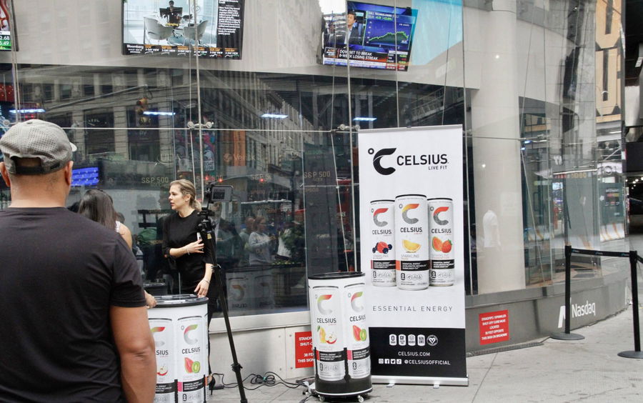 Celsius Live Fit celebrates 5 Years at Nasdaq. May 27, 2022, New York, USA: The energy drink company, Celsius Live Fit celebrates 5 years at Nasdaq with participation of some staff cheering and holding up the energy drinks to the delights of all around. Drinks and T shirts are giving out to passerby. Foto: Niyi Fote/TheNews2/imago images Celsius Live Fit celebrates 5 Years at Nasdaq. PUBLICATIONxNOTxINxUSA Copyright: xNiyixFotex