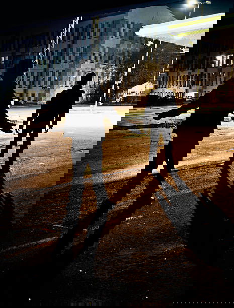 two dark figures face off on dark alley.