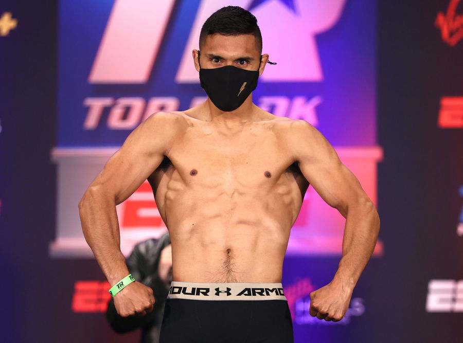 LAS VEGAS, NEVADA – MAY 21: Eduardo Garza flexes on the scale ahead of his fight with Andres Cortes at Virgin Hotels Las Vegas on May 21, 2021 in Las Vegas, Nevada. (Photo by Mikey Williams/Top Rank Inc via Getty Images)