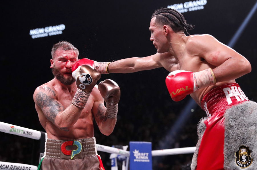 LAS VEGAS, NEVADA – MARCH 25: Caleb Plant (L) takes a punch from David Benavidez during a WBC super middleweight fight at MGM Grand Garden Arena on March 25, 2023 in Las Vegas, Nevada. Benavidez retained his WBC interim super middleweight title by unanimous decision. (Photo by Steve Marcus/Getty Images)