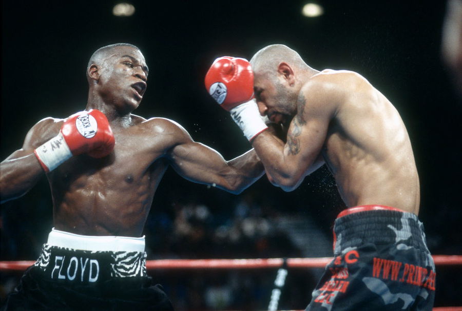 LAS VEGAS, NV – JANUARY 20: Floyd Mayweather Jr. and Diego Corrales fight for the WBC and Lineal super featherweight titles on January 20, 2001 at the MGM Grand Garden Arena in Las Vegas, Nevada. Mayweather Jr. won the fight with a 10th round TKO. (Photo by Focus on Sport/Getty Images)