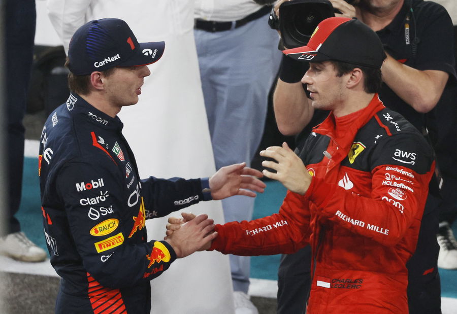 Formula One F1 – Abu Dhabi Grand Prix – Yas Marina Circuit, Abu Dhabi, United Arab Emirates – November 26, 2023 First placed Red Bull’s Max Verstappen shakes hands with second placed Ferrari’s Charles Leclerc after the race Pool via REUTERS/Hamad I Mohammed