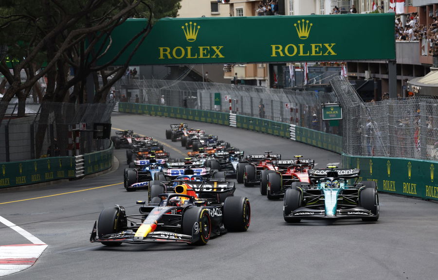Formula One F1 – Monaco Grand Prix – Circuit de Monaco, Monte Carlo, Monaco – May 28, 2023 Red Bull’s Max Verstappen leads into the first corner at the start of the race ahead of Aston Martin’s Fernando Alonso REUTERS/Piroschka Van De Wouw