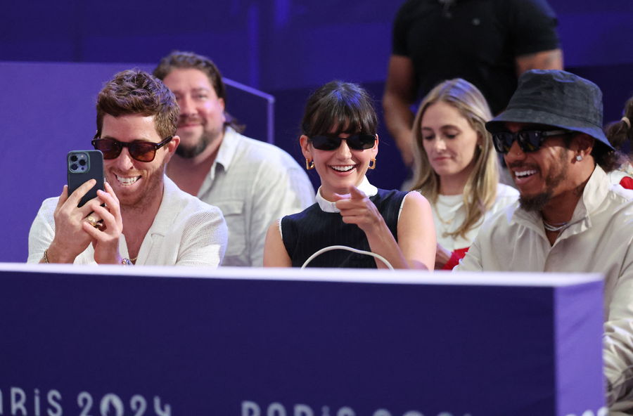Paris 2024 Olympics – Fencing – Men’s Foil Team Bronze Medal Match – Grand Palais, Paris, France – August 04, 2024. Formula One driver Lewis Hamilton in attendance with former snowboarder and skateboarder Shaun White and Nina Dobrev during the Bronze medal match between United States and France. REUTERS/Maye-E Wong