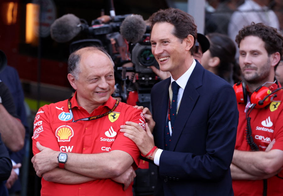 Formula One F1 – Monaco Grand Prix – Circuit de Monaco, Monaco – May 26, 2024 Ferrari team principal Frederic Vasseur and executive director of Stellantis John Elkann after Ferrari’s Charles Leclerc wins the Monaco Grand Prix REUTERS/Claudia Greco/Pool