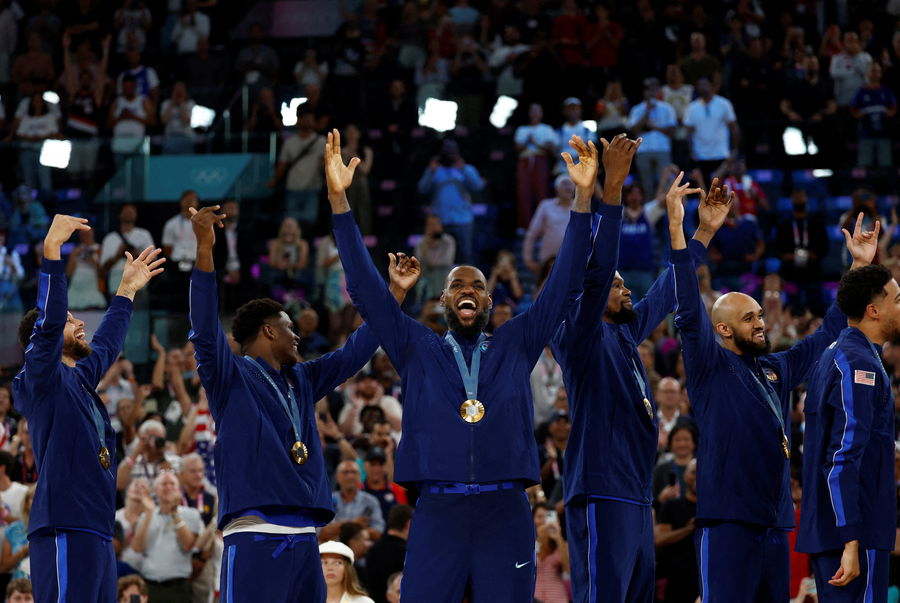 Paris 2024 Olympics – Basketball – Men’s Victory Ceremony – Bercy Arena, Paris, France – August 10, 2024. Gold medallists Lebron James of United States, Stephen Curry of United States, Anthony Edwards of United States, Kevin Durant of United States and Derrick White of United States celebrate on the podium. REUTERS/Evelyn Hockstein TPX IMAGES OF THE DAY