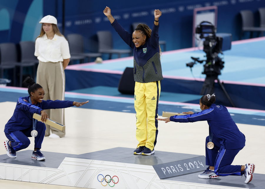 Paris 2024 Olympics – Artistic Gymnastics – Women’s Floor Exercise Victory Ceremony – Bercy Arena, Paris, France – August 05, 2024. Gold medallist Rebeca Andrade of Brazil, silver medallist Simone Biles of United States, and bronze medallist Jordan Chiles of United States celebrate on the podium. REUTERS/Peter Cziborra