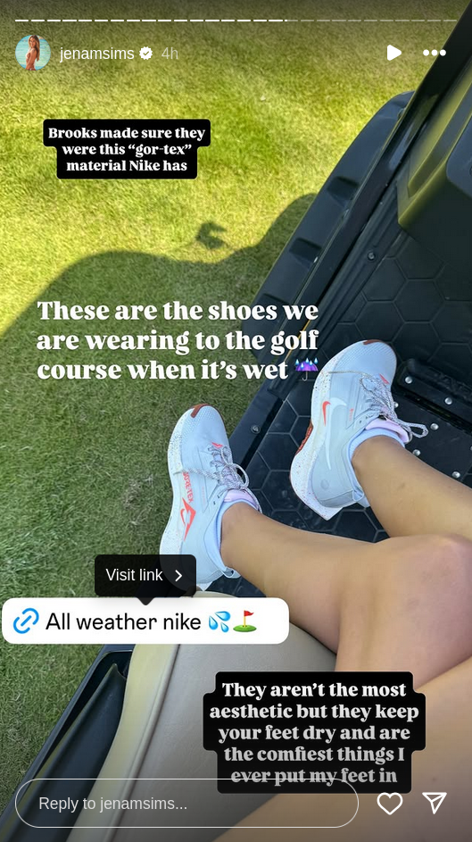According to Sims’ recent Instagram story, one of Koepka’s shoe suggestions finally won her over! And it’s definitely a personal win for Koepka. Why? Well, Sims seems to prioritize comfort over “aesthetics” by choosing to listen to him – a win, considering Sims is a well-known model. In her latest Instagram story, Jena Sims shared a picture of the $180 Nike shoes her husband suggested to her and gave her verdict on the “All weather nike 💦⛳“: “Brooks made sure they were this ‘gor-tex’ material Nike has. They aren’t the most aesthetic but they keep your feet dry and are the comfiest things I ever put my feet in.”