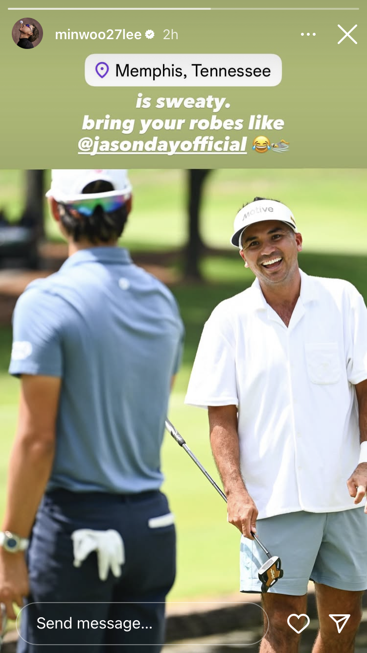 His latest Malbon getup at TPC Southwind featured a long, flowy, robe-style overshirt that may or may not have doubled as a sauna suit. And fellow Aussie player, Min Woo Lee, couldn’t help but poke fun at Day’s choice of outfit for the day during their practice round together. Min Woo Lee shared a picture on his Instagram story alongside Day, which was captioned, “Memphis is sweaty. Bring your robes like @JasonDay.” Lee’s hilarious jab at Jason Day instantly lit up social media, with fans cracking up over the cheeky reference to Day’s flowing, robe-like outfit — a signature Malbon piece that looked more like a spa day than a tournament.