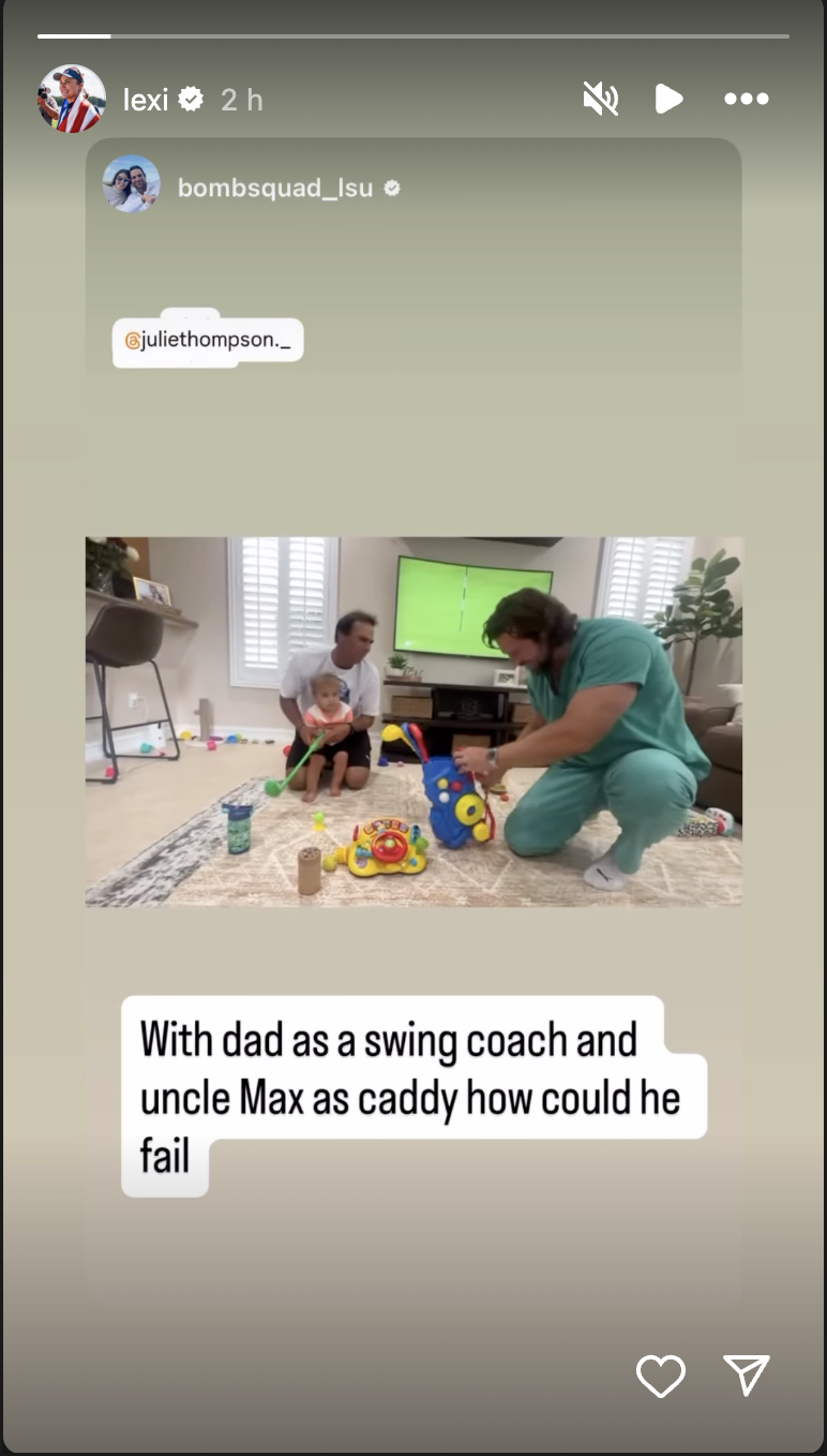 On her Instagram story a few hours ago, Thompson shared a lighthearted clip featuring her young nephew swinging toy golf clubs, with his dad, Curtis Thompson, Lexi’s brother, acting as a ‘swing coach’ and her fiancé, Max Provost, stepping in as ‘caddy.’ The playful moment was captioned — “With dad as swing coach and Uncle Max as caddy how could he fail.” It was a rare personal update from the major champion, offering fans a peek into the supportive, golf-loving environment she’s surrounded by even while on hiatus.
