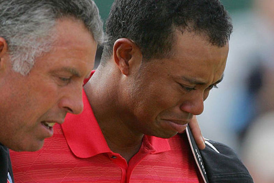 Tiger Woods, with his caddie Steve Williams, walks off the 18th green crying after winning the 135th Open Championship at Royal Liverpool Golf Club in Hoylake, Great Britain on July 23, 2006. (Image Credit: Getty Images)