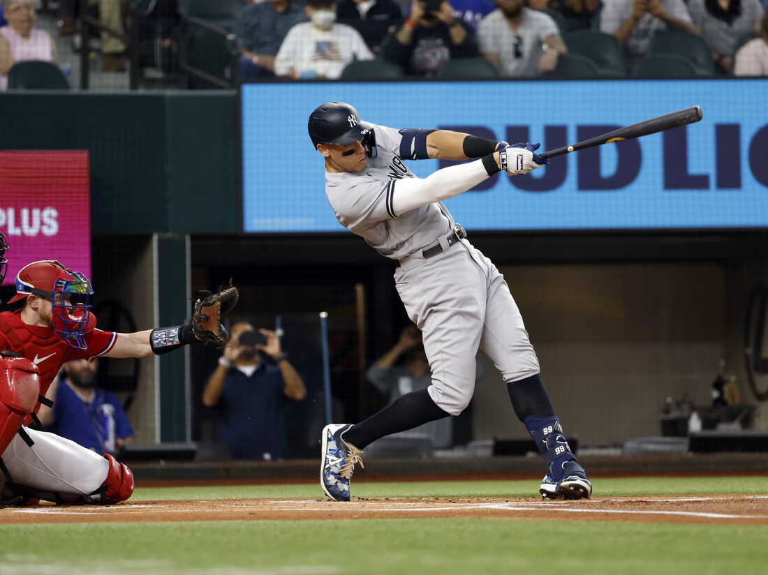 ARLINGTON, TX – OCTOBER 4: Aaron Judge #99 of the New York Yankees hits his 62nd home run of the season against the Texas Rangers during the first inning in game two of a double header at Globe Life Field on October 4, 2022 in Arlington, Texas. Judge has now set the American League record for home runs in a single season. (Photo by Ron Jenkins/Getty Images)