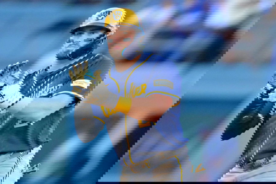 MLB, Baseball Herren, USA Playoffs-Milwaukee Brewers at Los Angeles Dodgers Oct 16, 2025 Los Angeles, California, USA Milwaukee Brewers third baseman Caleb Durbin 21 reacts at second after hitting a double against the Los Angeles Dodgers in the seventh inning during game three of the NLCS round for the 2025 MLB playoffs at Dodger Stadium. Los Angeles Dodger Stadium California USA, EDITORIAL USE ONLY PUBLICATIONxINxGERxSUIxAUTxONLY Copyright: xJaynexKamin-Onceax 20251016_lbm_aj4_095