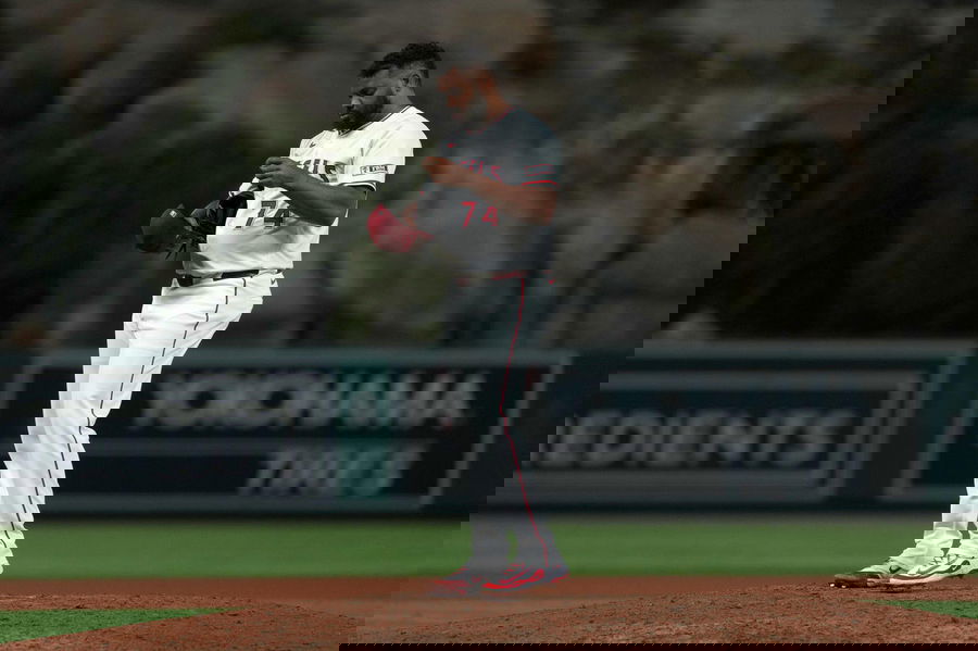 MLB, Baseball Herren, USA Chicago Cubs at Los Angeles Angels Aug 22, 2025 Anaheim, California, USA Los Angeles Angels relief pitcher Kenley Jansen 74 reacts in the ninth inning against the Chicago Cubs at Angel Stadium. Anaheim Angel Stadium California United States, EDITORIAL USE ONLY PUBLICATIONxINxGERxSUIxAUTxONLY Copyright: xKirbyxLeex 20250822_lbm_al2_305
