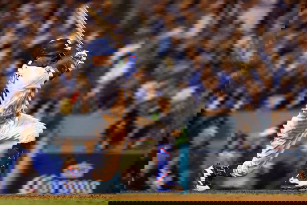 LOS ANGELES, CALIFORNIA – OCTOBER 12: Mookie Betts #50 of the Los Angeles Dodgers hits a double in the seventh inning in game two of the National League Division Series against the San Diego Padres at Dodger Stadium on October 12, 2022, in Los Angeles, California. (Photo by Ronald Martinez/Getty Images)
