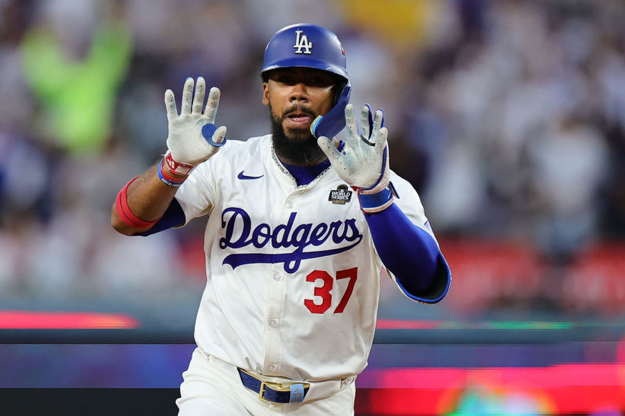 LOS ANGELES, CALIFORNIA – OCTOBER 26: Teoscar Hernández #37 of the Los Angeles Dodgers celebrates his two-run home run as he runs the bases against the New York Yankees in the third inning during Game Two of the 2024 World Series at Dodger Stadium on October 26, 2024 in Los Angeles, California. (Photo by Alex Slitz/Getty Images)