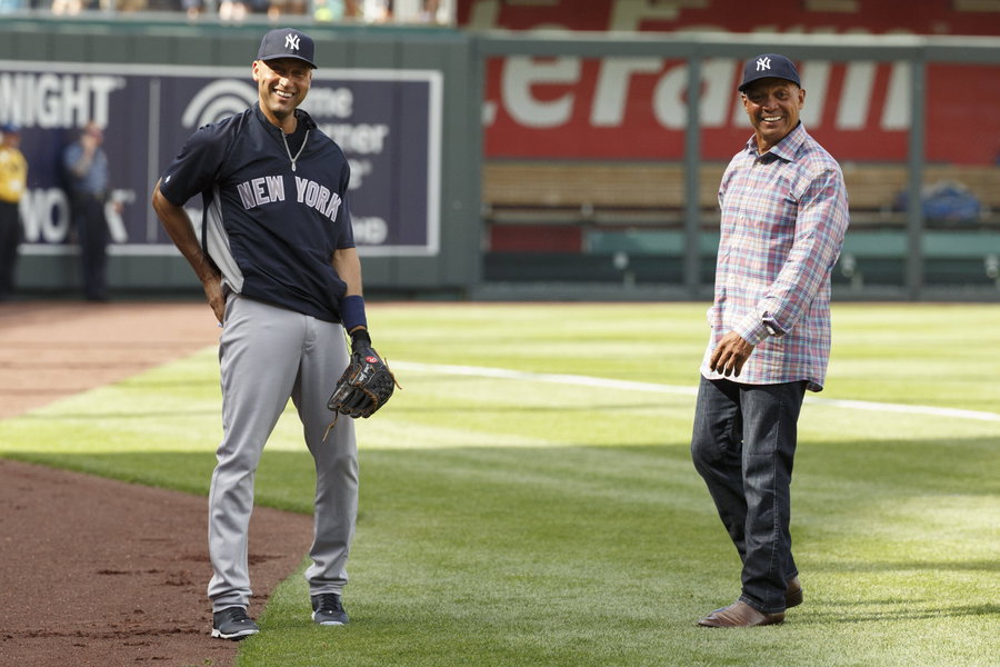 MLB, Baseball Herren, USA 2014: Yankees vs Royals JUN 07 June 7, 2014: New York Yankees shortstop Derek Jeter 2 talks with Former New York Yankees Reggie Jackson during warm-ups prior to the game between the New York Yankees vs the Kansas City Royals at Kauffman Stadium in Kansas City, Missouri. Christopher Szagola/Cal Media Kansas City Missouri U.S. EDITORIAL USE ONLY Copyright: xx ZUMA-20140607_zaf_cs7_022.jpg ChrisxSzagolax csmphoto923075