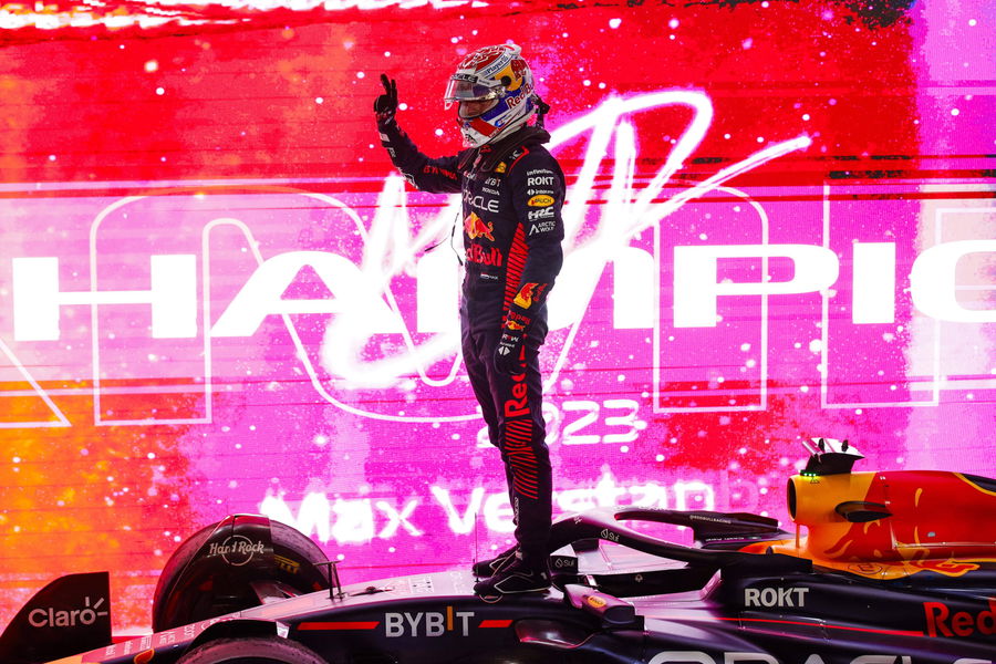 VERSTAPPEN Max ned, Red Bull Racing RB19, 3-time World Champion celebration during the 2023 Formula 1 Qatar Grand Prix, 17th round of the 2023 Formula One World Championship, WM, Weltmeisterschaft from October 6 to 8, 2023 on the Lusail International Circuit, in Doha, Qatar – F1 – QATAR GRAND PRIX 2023 DPPI/Panoramic PUBLICATIONxNOTxINxFRAxBEL _R3_8305
