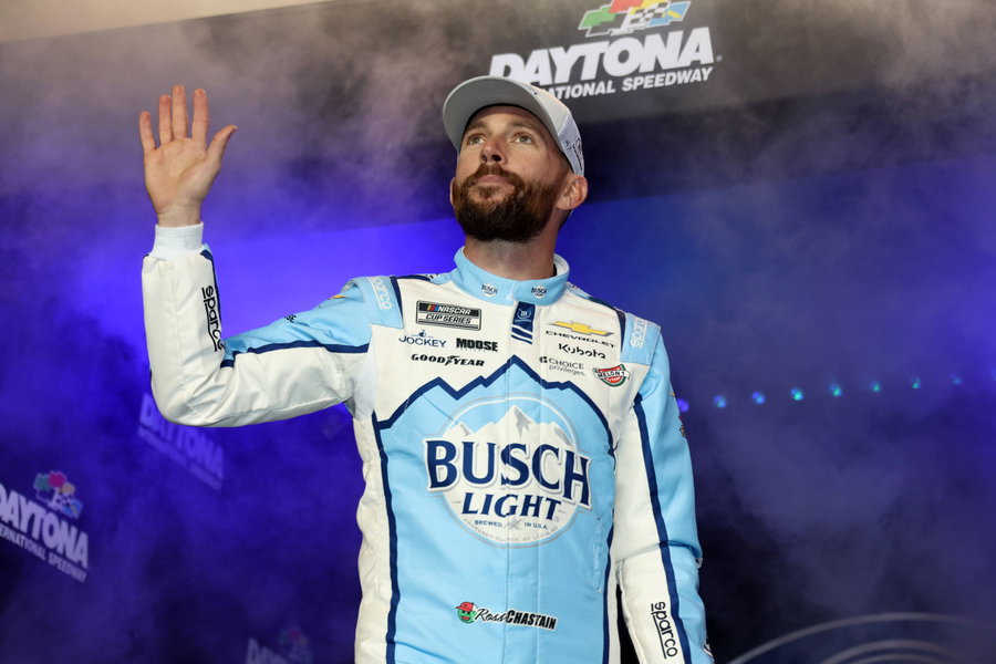 DAYTONA BEACH, FL – FEBRUARY 12: Ross Chastain, 1 TrackHouse Racing Busch Light Chevrolet, waves to the crowd prior to the running of the NASCAR, Motorsport, USA Cup Series Daytona 500 Duel 1 on February 12, 2026, at Daytona International Speedway in Daytona Beach, FL. Photo by Jeff Robinson/Icon Sportswire AUTO: FEB 12 NASCAR Cup Series Daytona 500 Duels 1 EDITORIAL USE ONLY Icon2602122340