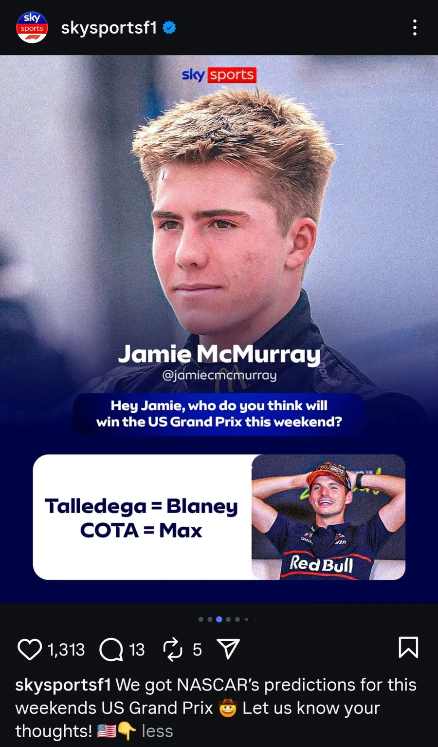 Jamie, when asked for his predictions, named “Talladega = Blaney and COTA = Max,” giving his candid picks for wins at both NASCAR and F1 events. However, instead of showing Jamie’s picture with his answer, the broadcaster posted an image of his son, Carter McMurray, alongside a misspelled “Talledega.”