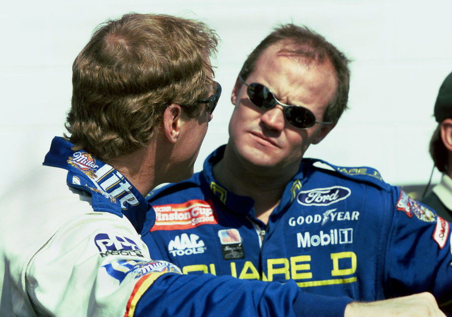 Kenny Wallace (re.) im Gespräch mit seinem Bruder Rusty Wallace (beide USA / beide Ford) – PUBLICATIONxINxGERxSUIxAUTxHUNxONLY (RIR98091206); Vneg, quer, close, Brüder, Familie, Geschwister, Gebrüder, Bruderpaar, Brüderpaar Select Batteries 400 Nascar Winston Cup Series 1998, US Rennserie, Autorennen Richmond, Virginia Richmond International Raceway Skepsis, Motorsport Herren Einzel USA Gruppenbild pessimistisch Randmotiv Personen