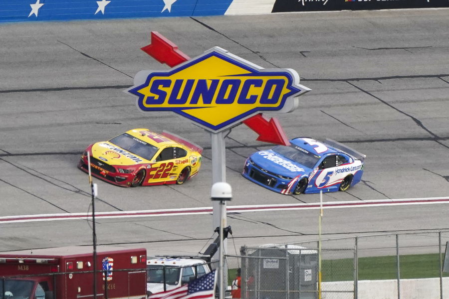 Mar 21, 2021; Hampton, Georgia, USA; NASCAR Cup Series driver Joey Logano (22) is being chased by NASCAR Cup Series driver Kyle Larson (5) the leader at Atlanta Motor Speedway. Mandatory Credit: Marvin Gentry-USA TODAY Sports