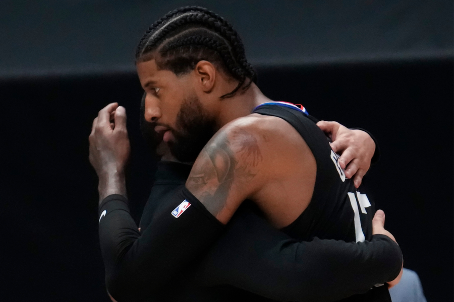 Jun 30, 2021; Los Angeles, California, USA; LA Clippers guard Paul George (right) hugs head coach Tyronn Lue in the closing minutes of the Clippers loss against the Phoenix Suns during game six of the Western Conference Finals of the 2021 NBA Playoffs at Staples Center. Mandatory Credit: Robert Hanashiro-Imagn Images