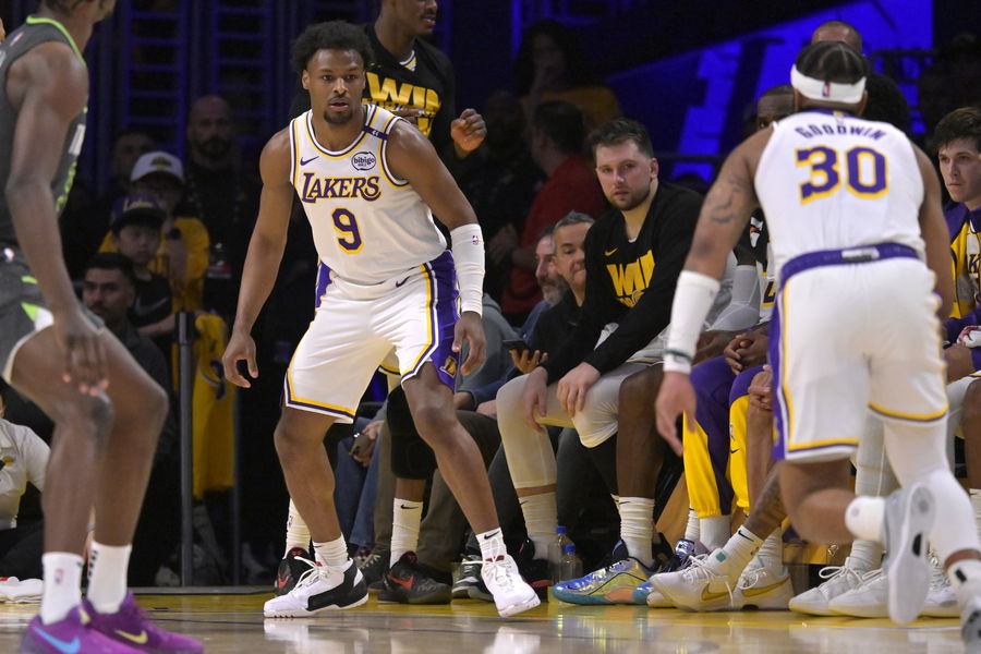 Apr 19, 2025; Los Angeles, California, USA; Los Angeles Lakers guard Bronny James (9) defends on the court in the second half against the Minnesota Timberwolves at Crypto.com Arena. Mandatory Credit: Jayne Kamin-Oncea-Imagn Images