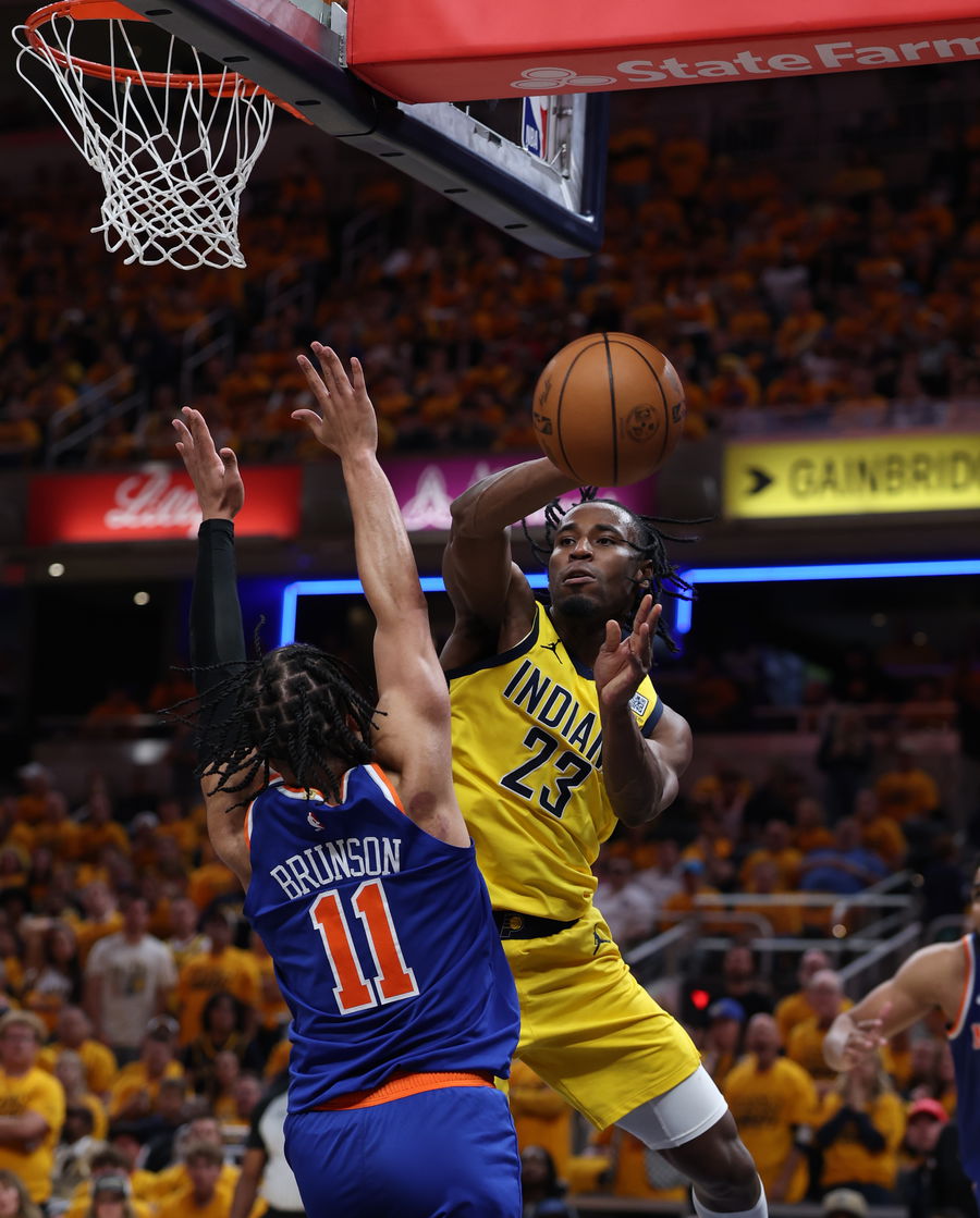 May 25, 2025; Indianapolis, Indiana, USA; Indiana Pacers forward Aaron Nesmith (23) passes around New York Knicks guard Jalen Brunson (11) during the third quarter of game three of the Eastern Conference Finals for the 2025 NBA Playoffs at Gainbridge Fieldhouse. Mandatory Credit: Trevor Ruszkowski-Imagn Images