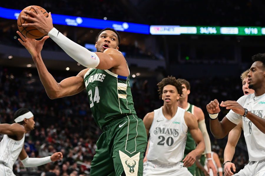 Mar 5, 2025; Milwaukee, Wisconsin, USA; Milwaukee Bucks forward Giannis Antetokounmpo (34) grabs a rebound against the Dallas Mavericks in the third quarter at Fiserv Forum. Mandatory Credit: Benny Sieu-Imagn Images