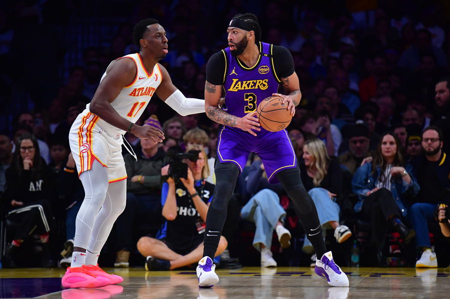 Jan 3, 2025; Los Angeles, California, USA; Los Angeles Lakers forward Anthony Davis (3) moves the ball against Atlanta Hawks forward Onyeka Okongwu (17) during the first half at Crypto.com Arena. Mandatory Credit: Gary A. Vasquez-Imagn Images