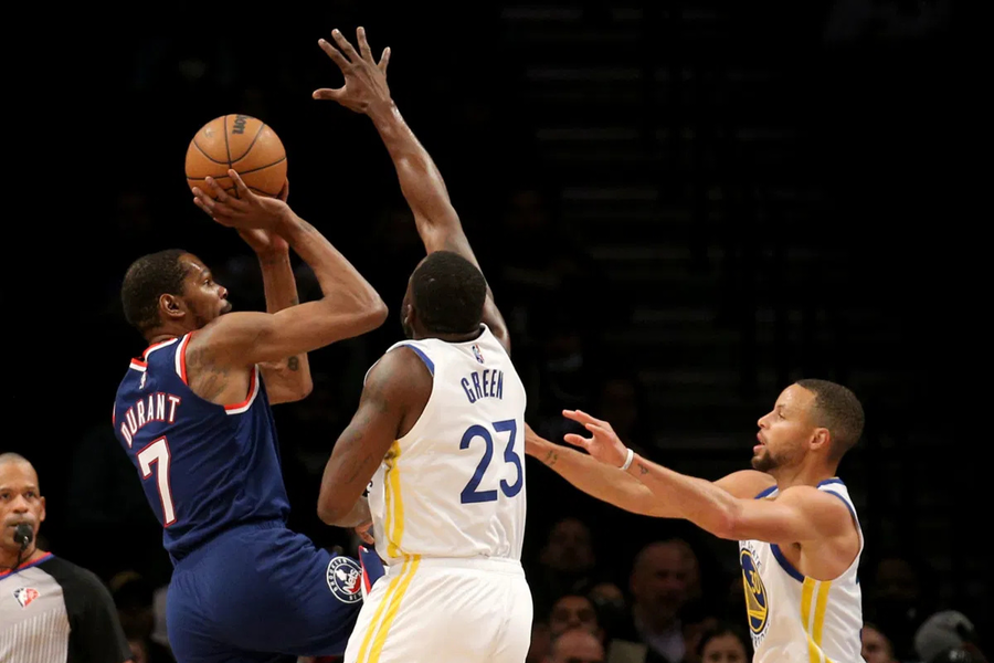 Nov 16, 2021; Brooklyn, New York, USA; Brooklyn Nets forward Kevin Durant (7) shoots against Golden State Warriors forward Draymond Green (23) and guard Stephen Curry (30) during the first quarter at Barclays Center. Mandatory Credit: Brad Penner-USA TODAY Sports