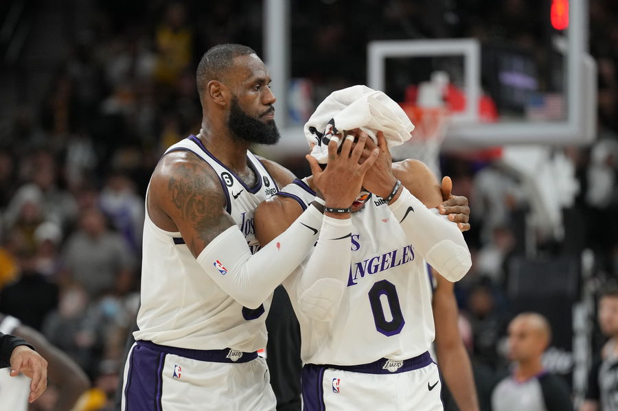 Nov 26, 2022; San Antonio, Texas, USA; Los Angeles Lakers forward LeBron James (6) holds a towel the the head of guard Russell Westbrook (0) after Westbrook was fouled by San Antonio Spurs forward Zach Collins (23) in the second half at the AT&T Center. Mandatory Credit: Daniel Dunn-USA TODAY Sports