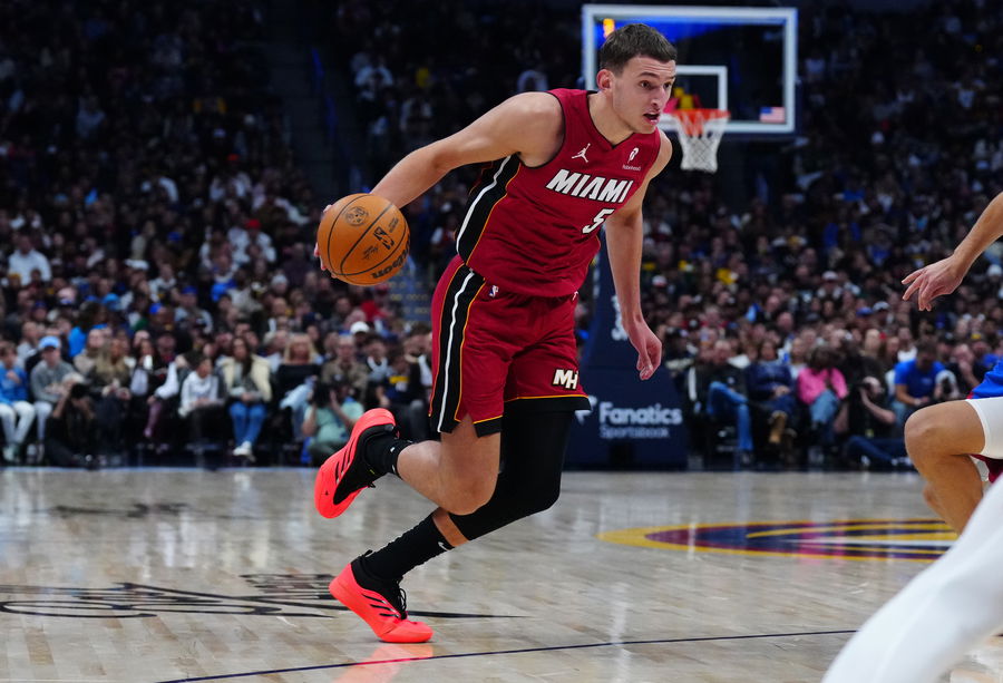 Nov 8, 2024; Denver, Colorado, USA; Miami Heat forward Nikola Jovic (5) drives to the basket in the second half against the Denver Nuggets at Ball Arena. Mandatory Credit: Ron Chenoy-Imagn Images