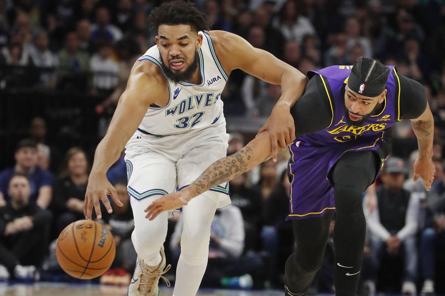 Dec 30, 2023; Minneapolis, Minnesota, USA; Los Angeles Lakers forward Anthony Davis (3) knocks the ball away from Minnesota Timberwolves forward Karl-Anthony Towns (32) in the first quarter at Target Center. Mandatory Credit: Bruce Kluckhohn-USA TODAY Sports