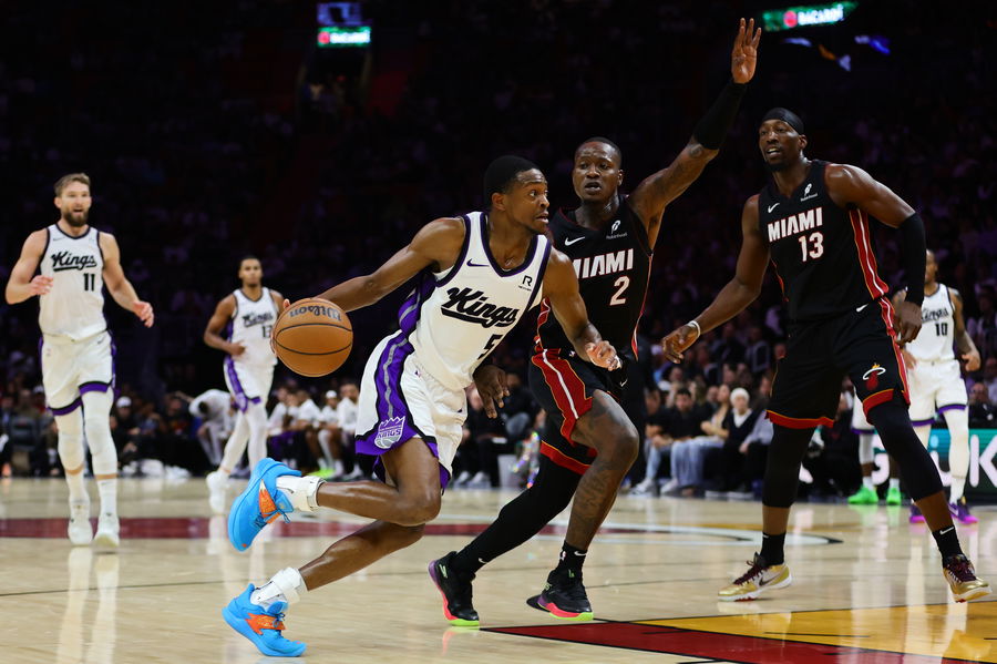 Nov 4, 2024; Miami, Florida, USA; Sacramento Kings guard De’Aaron Fox (5) drives to the basket against Miami Heat guard Terry Rozier (2) during the third quarter at Kaseya Center. Mandatory Credit: Sam Navarro-Imagn Images