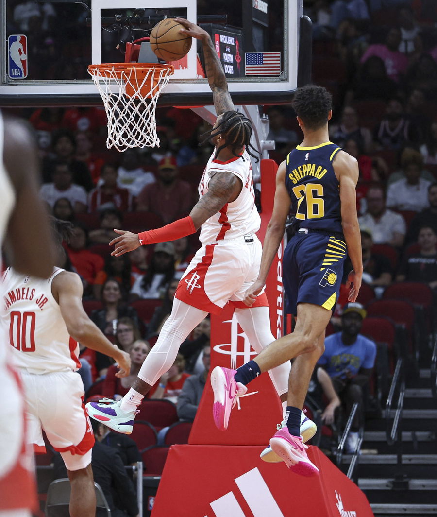Oct 10, 2023; Houston, Texas, USA; Houston Rockets forward Cam Whitmore (7) dunks the ball past Indiana Pacers guard Ben Sheppard (26) during the third quarter at Toyota Center. Mandatory Credit: Troy Taormina-USA TODAY Sports
