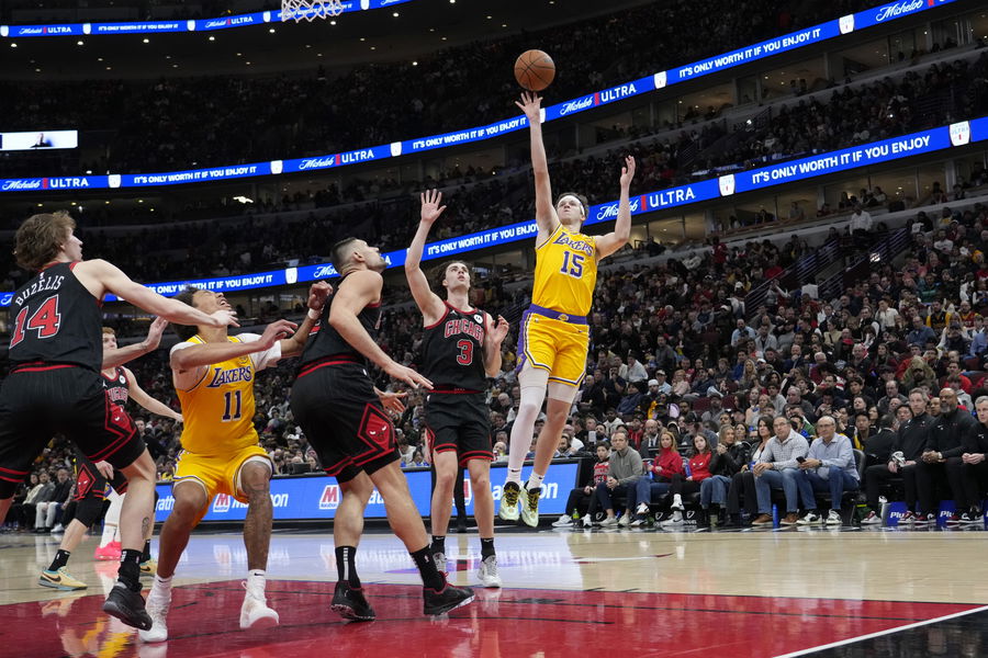 Mar 27, 2025; Chicago, Illinois, USA; Los Angeles Lakers guard Austin Reaves (15) shoots over Chicago Bulls center Nikola Vucevic (9) during the second half at United Center. Mandatory Credit: David Banks-Imagn Images