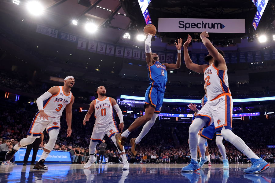 Jan 10, 2025; New York, New York, USA; Oklahoma City Thunder guard Shai Gilgeous-Alexander (2) drives to the basket against New York Knicks guards Josh Hart (3) and Jalen Brunson (11) and center Karl-Anthony Towns (32) during the first quarter at Madison Square Garden. Mandatory Credit: Brad Penner-Imagn Images