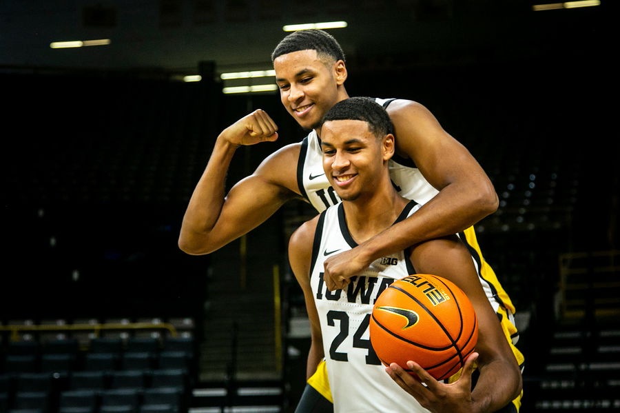 Iowa forward Keegan Murray flexes while posing for a photo with his twin brother Iowa forward Kris Murray (24) during Hawkeyes men’s basketball media day, Monday, Oct. 11, 2021, at Carver-Hawkeye Arena in Iowa City, Iowa.