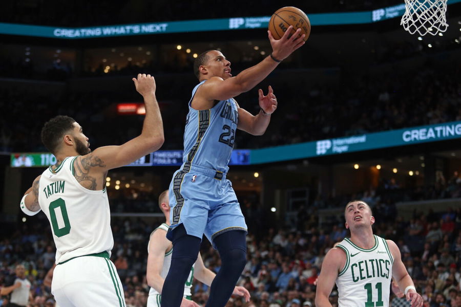Mar 31, 2025; Memphis, Tennessee, USA; Memphis Grizzlies guard Desmond Bane (22) drives to the basket between Boston Celtics forward Jayson Tatum (0) and guard Payton Pritchard (11) during the fourth quarter at FedExForum. Mandatory Credit: Petre Thomas-Imagn Images