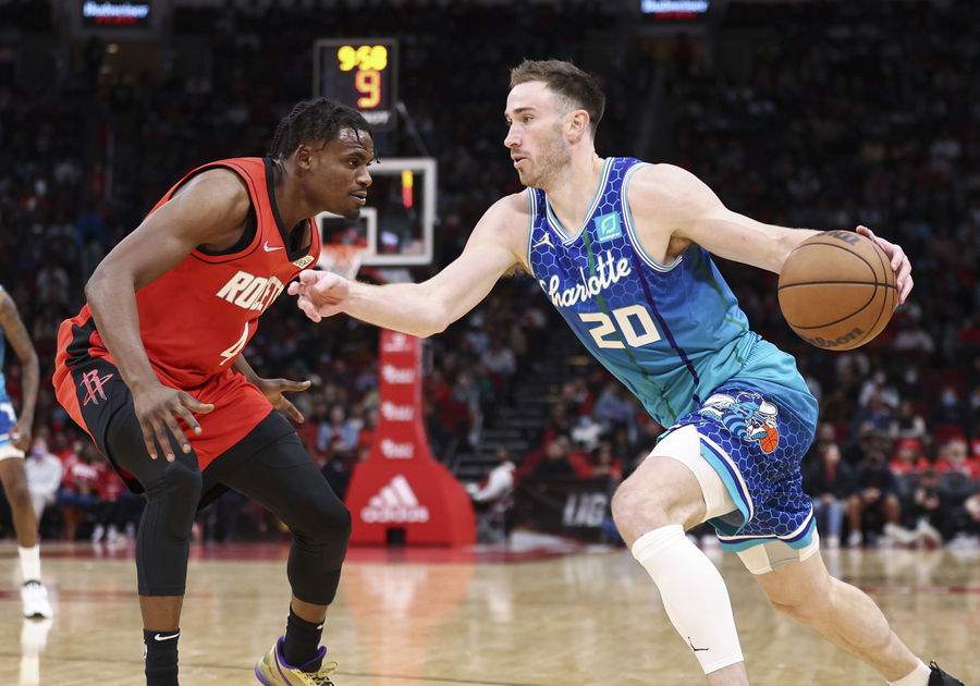 Nov 27, 2021; Houston, Texas, USA; Charlotte Hornets forward Gordon Hayward (20) dribbles the ball as Houston Rockets forward Danuel House Jr. (4) defends during the fourth quarter at Toyota Center. Mandatory Credit: Troy Taormina-USA TODAY Sports